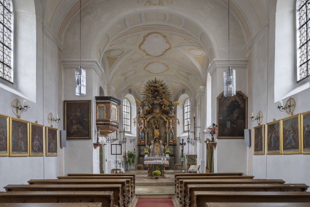 Beim Betreten des spätromanischen Langhauses aus dem 13. Jahrhundert umfängt den Besucher ein gedämpftes Licht, das durch barocke Rundbogenfenster fällt und die gotischen Wandfresken sanft beleuchtet. Besonders eindrucksvoll ist der Hochaltar von 1713, der leicht in den Raum gerückt steht – eine kleine Besonderheit, die das Gotteshaus unverwechselbar macht.