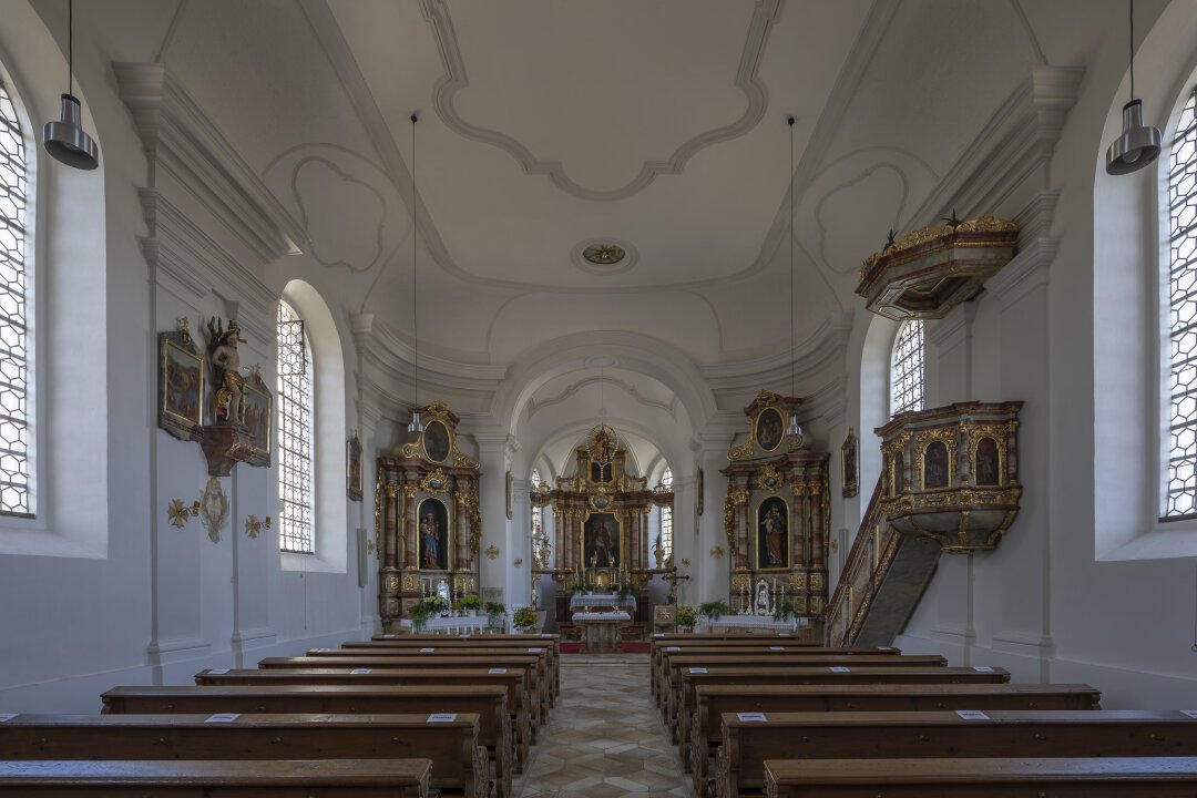 Im Inneren öffnet sich ein lichtdurchfluteter Saalraum: rechteckig, mit flacher Holzbalkendecke, an dessen Ende sich der sakrale Blickfang – der Hochaltar – erhebt, flankiert von symmetrisch angeordneten Seitenaltären.